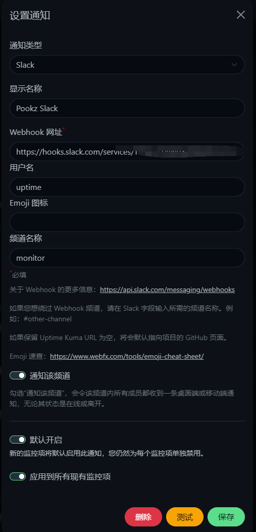 - 最后在uptime上设置slack 推送地址